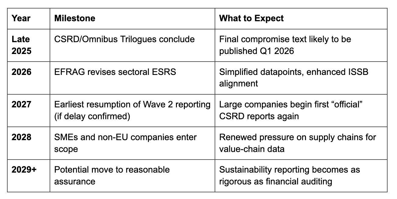 - Delays CSRD application by two years for Waves 2 and 3 (i.e., large companies not yet reporting and listed SMEs).